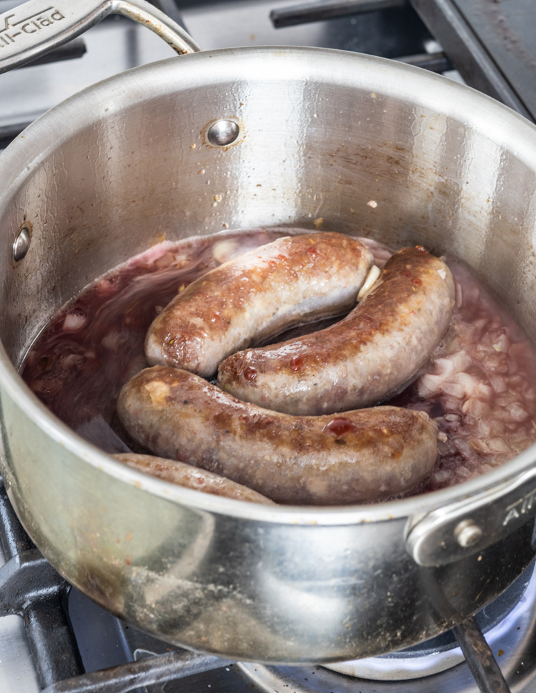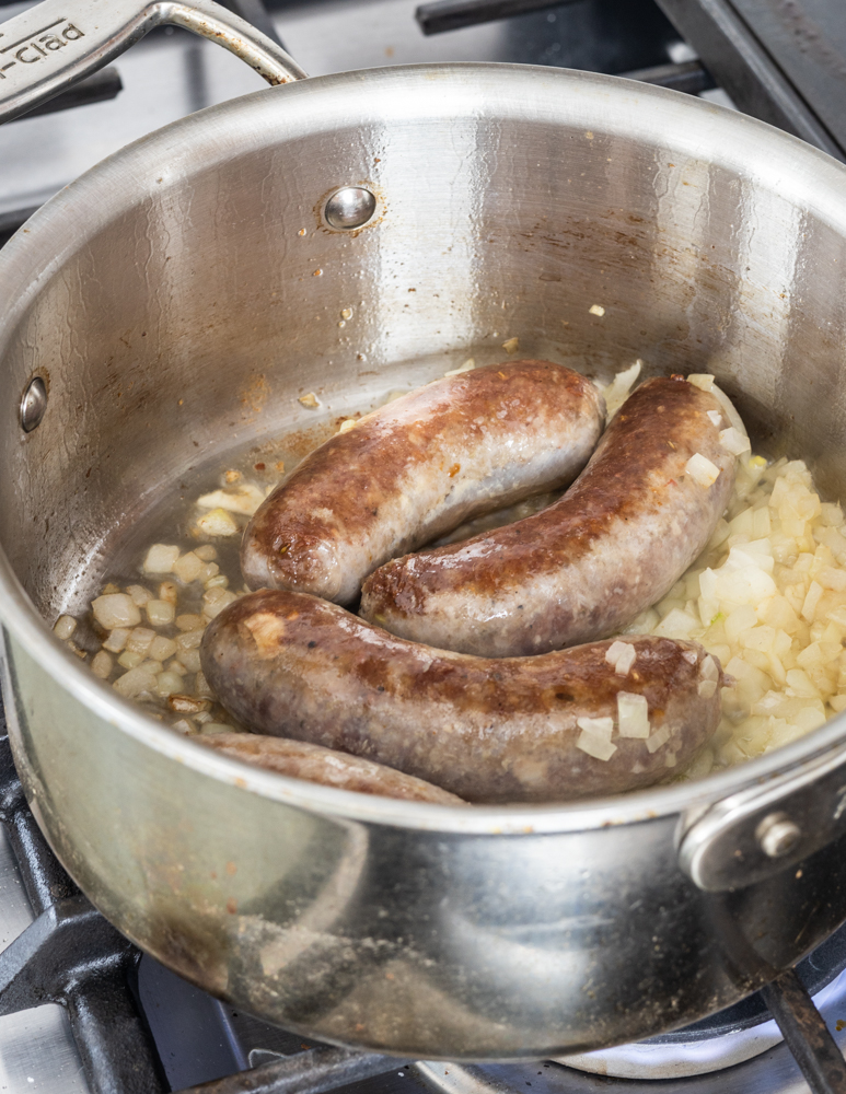 • Heat a 3 quart sauce pot with the cooking oil until hot. Add the sausages and allow to cook for a few minutes on medium heat until lightly browned on both sides.