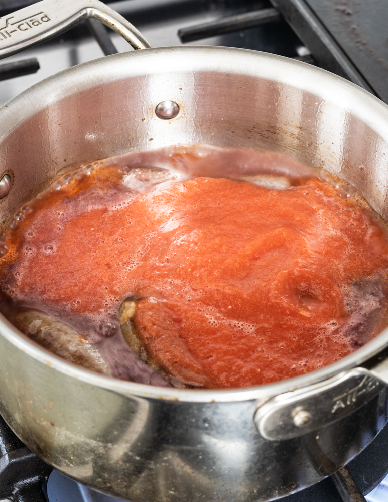 • Add the red wine and scrape up the browned bits on the bottom of the pan with a wooden spoon.
