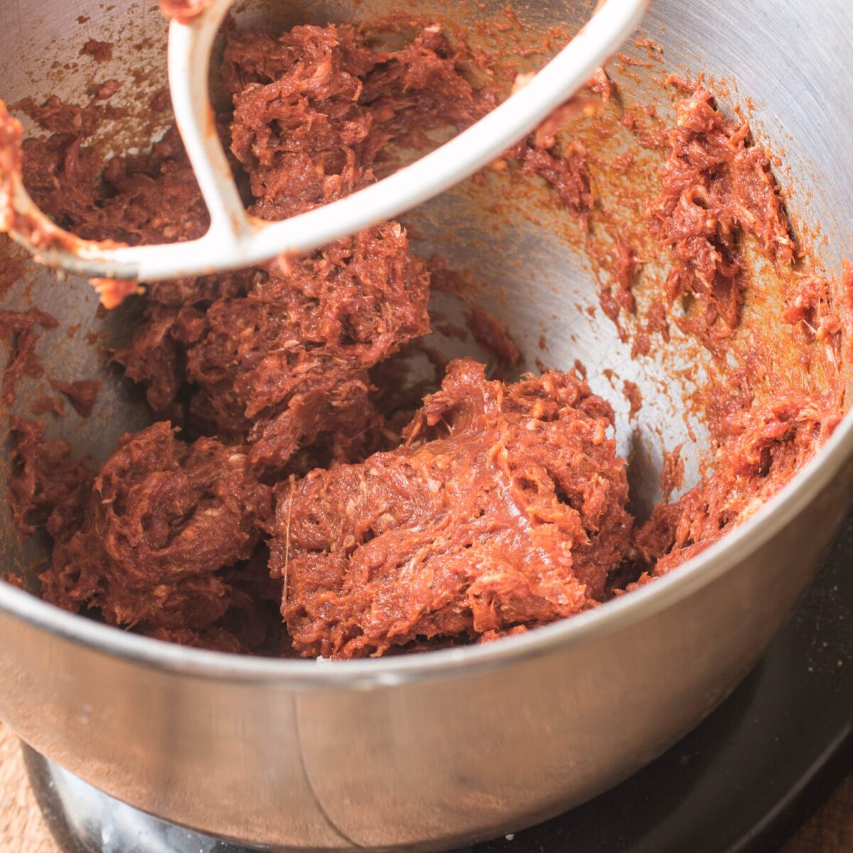 - Combine the ground lamb with the harissa, the paprika and the salt in the bowl of a stand mixer with the paddle attachment, and blend on low speed until tacky, about 2 minutes, drizzling in the red wine vinegar as it blends. You can also wear gloves and mash the meat around with your hands if you don't have a mixer.