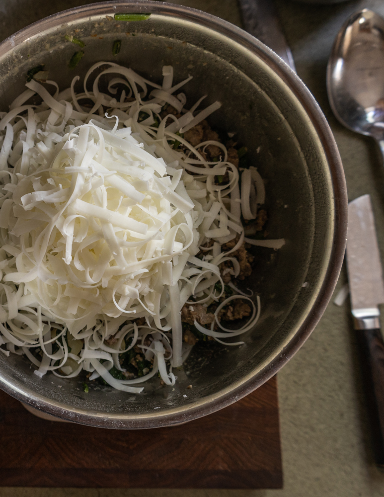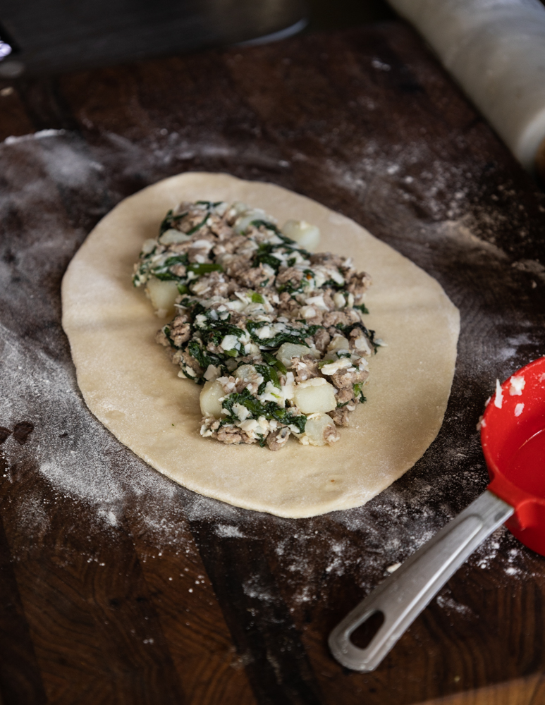 Making the dough is easy. After it’s risen once, you can keep it in the freezer and pull it out as you need. For the filling, I cook some lump sausage and break it into pieces, mix it with cooked, diced or mashed potato, plenty of cheese, and some wilted spinach beet or wild beet greens from my garden. You can use any leafy green you have available-chard and spinach work well.