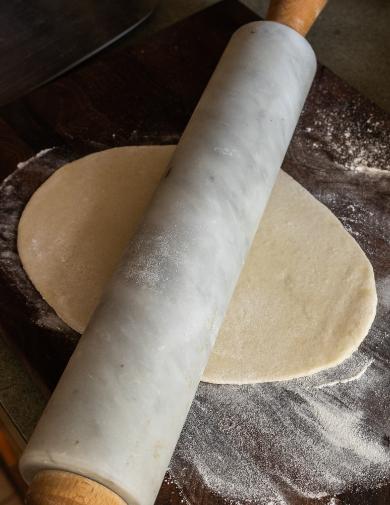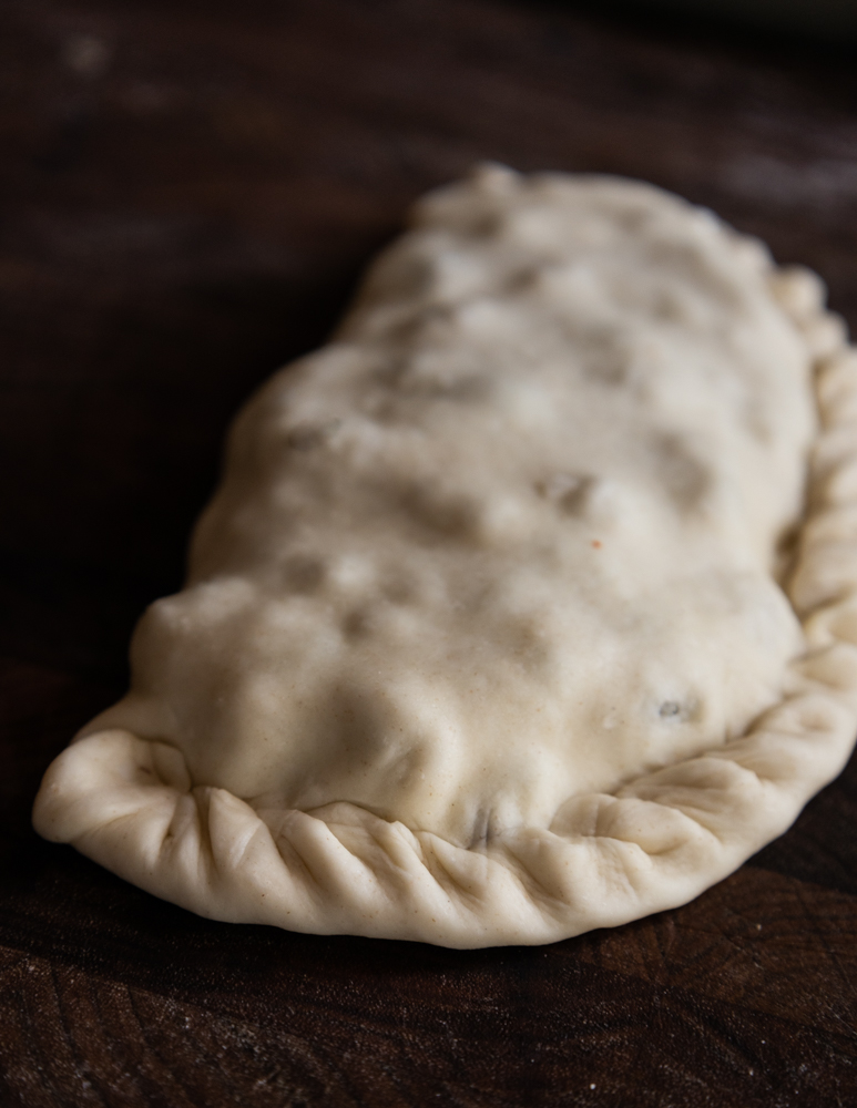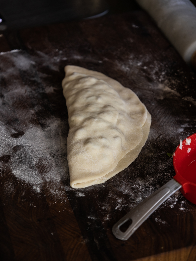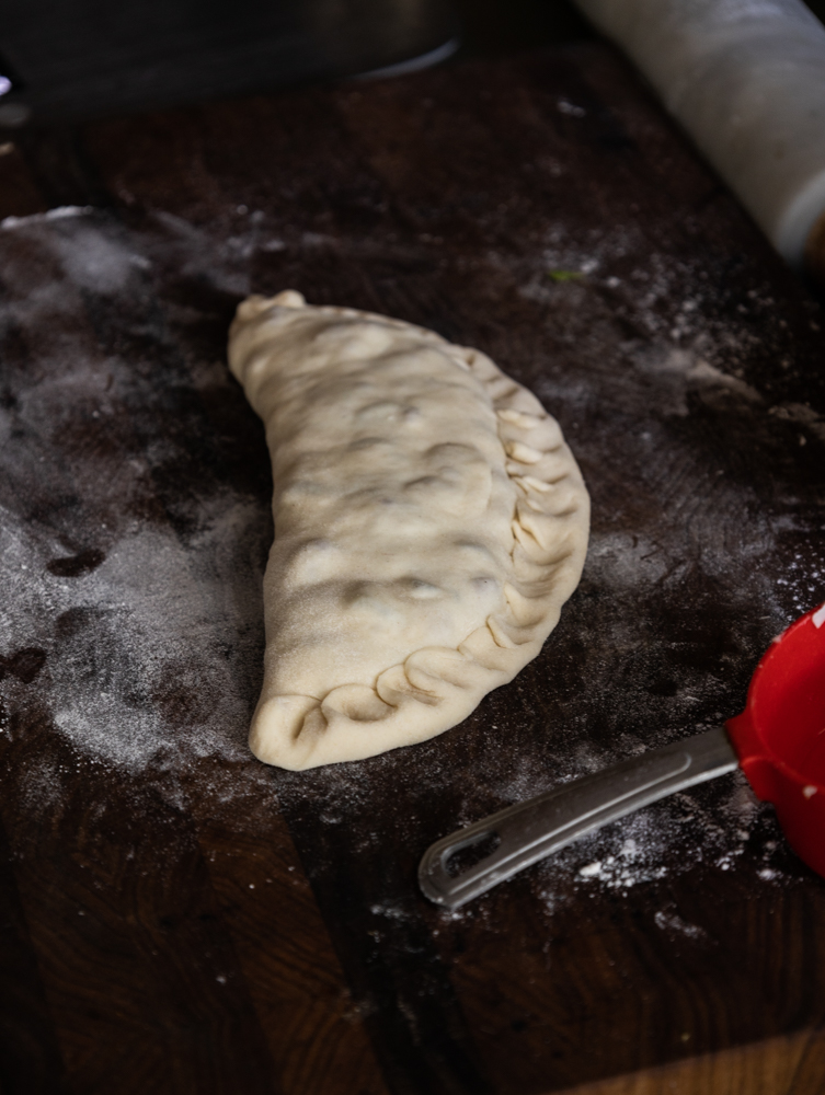 - On a lightly floured surface, roll each ball of dough out into a rough circle. Put generous ½ cups of the sausage and cheese filling off-center on each circle of dough, then fold over the other side. Seal the edges with the tines of a fork or fold them over as you would a hand pie or empanada.