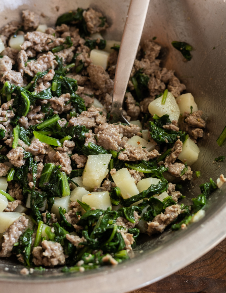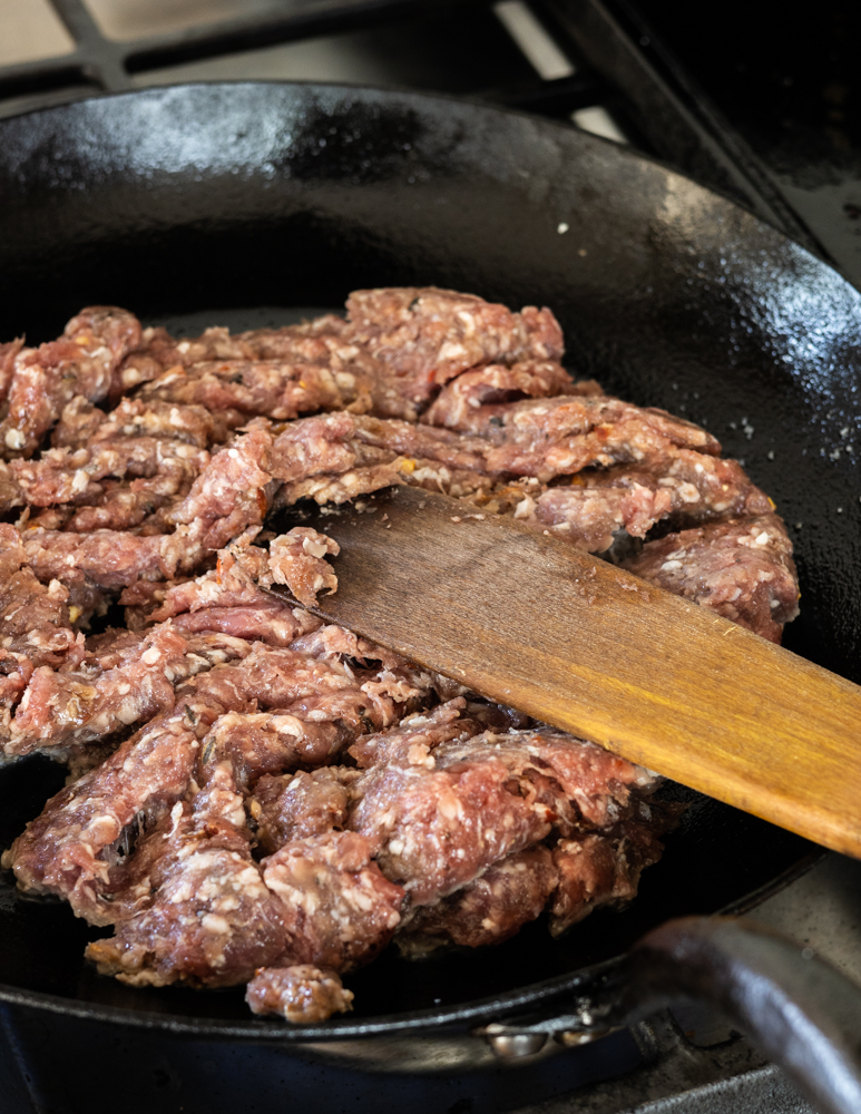 Here I’ve used my lamb Italian sausage. It’s one of my favorite sausage recipes and works really well with ground lamb or goat from Shepherd Song Farm. If you want to make your own Italian sausage, you can use my recipe here. If you do make your own sausage, it will have the best flavor if you make it at least 12 hours ahead of time.