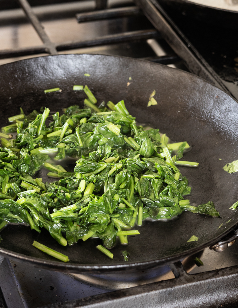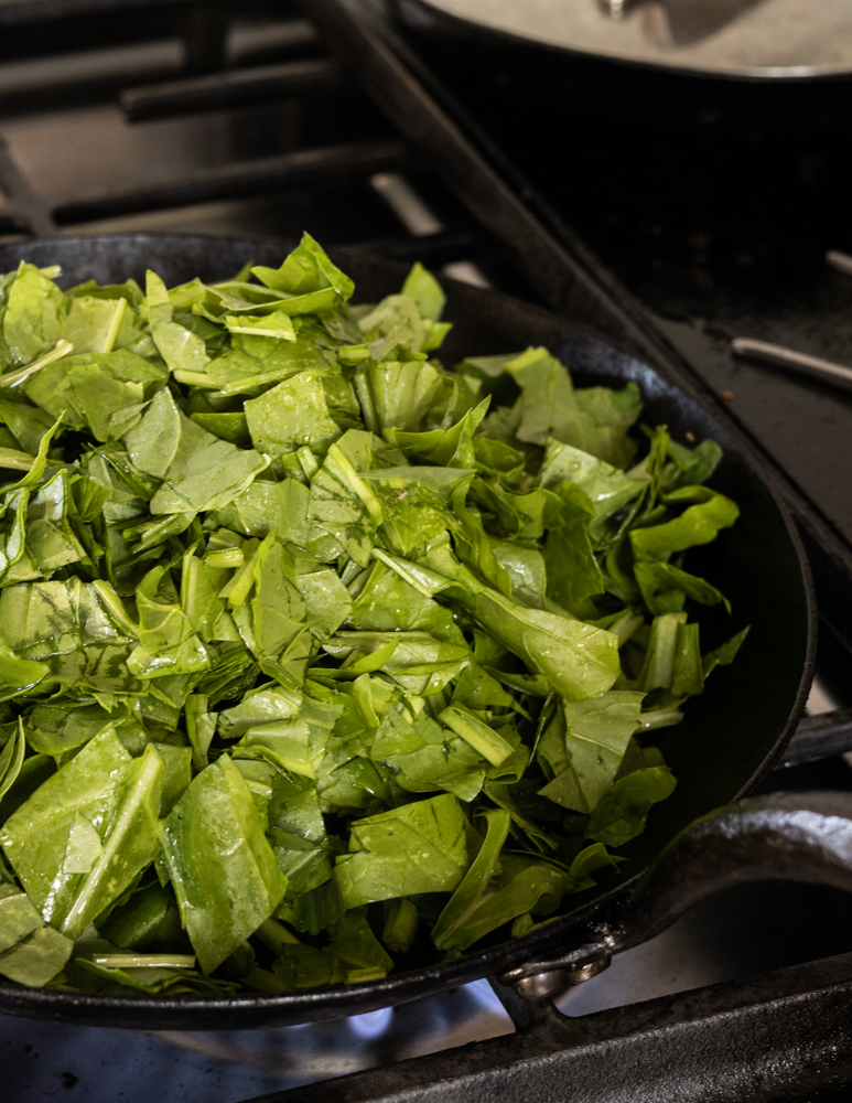 - Add the greens to the pan the sausage was cooked in and wilt. Add the cooked greens to the sausage.