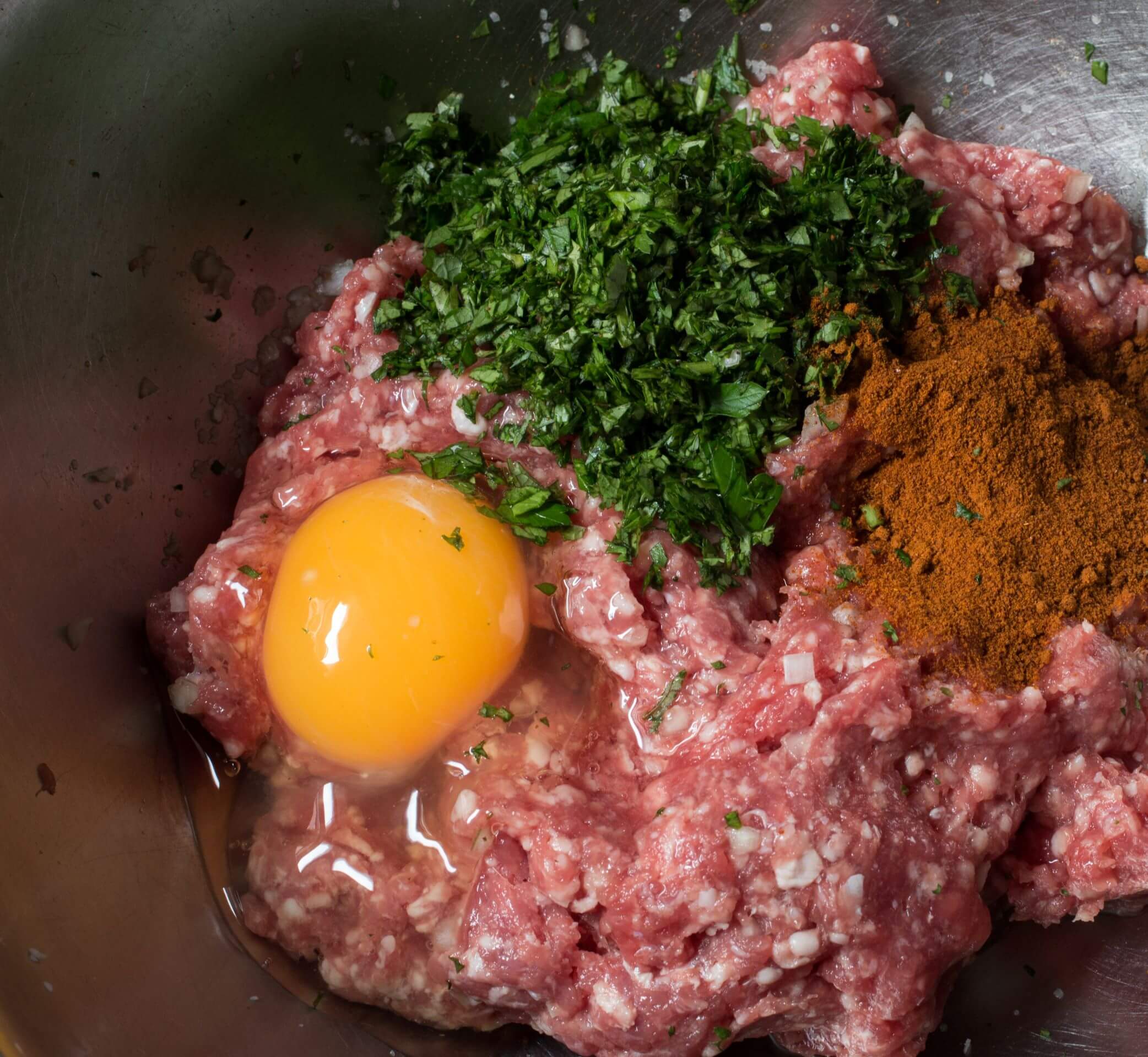 - Combine the ground lamb, parsley, cilantro, mint, onion, cumin, cayenne, paprika, black pepper, eggs, and salt in a large bowl and mix well.