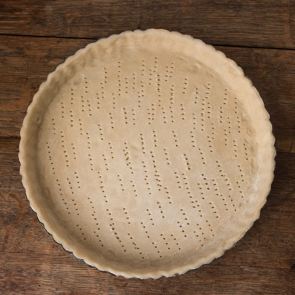- Preheat the oven to 350. Remove the dough and roll it out to the shape of the tart pan on a floured surface. Press the dough into a greased tart pan, then perforate with a fork, cover with aluminum foil and fill with pie weights, such as dried lentils or beans. Bake the crust for 30 minutes, then remove and cool.