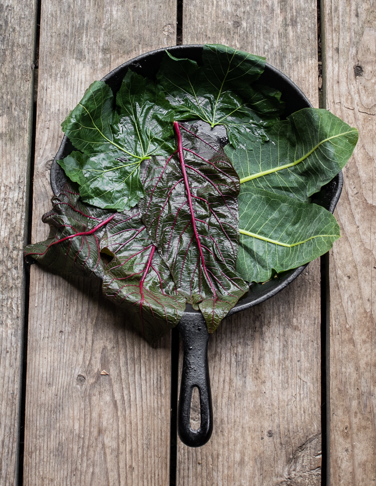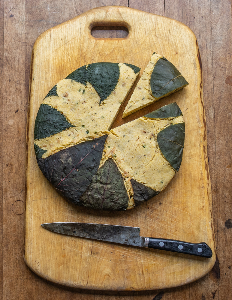 For an extra flourish, I wrap the cornbread here in wild leaves I harvest. If you have some chard, kale, or grape leaves, you can use some of those, but it is completely fine all by itself cooked in a cast iron pan if you don’t want to use the leaves, or don’t have access to any. Think of it as an option for when you’d like to be creative.