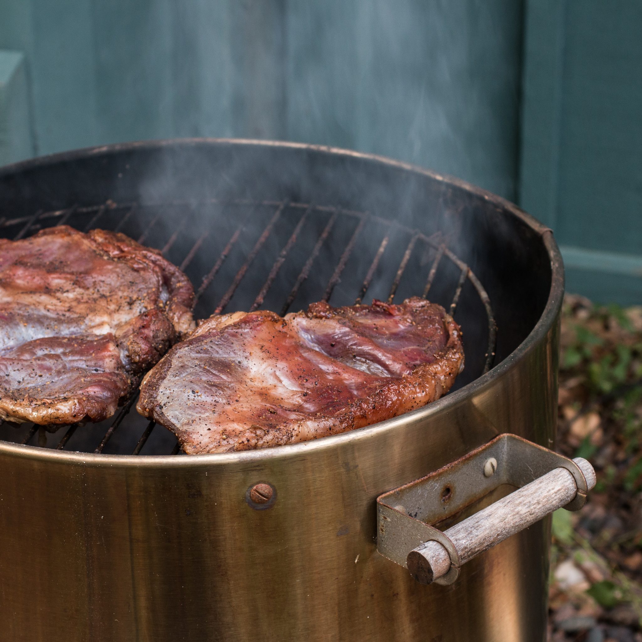 - Put the grill rack down and lay the cured meat flat on the grill grates, making sure to place it on the opposite side of the coals. Smoke the bacon, keeping the heat as low as possible for 45 minutes-1 hour, turning the meat occasionally and adding more wood chips as needed to get a good, consistent smoke. Meanwhile, preheat the oven to 300.
