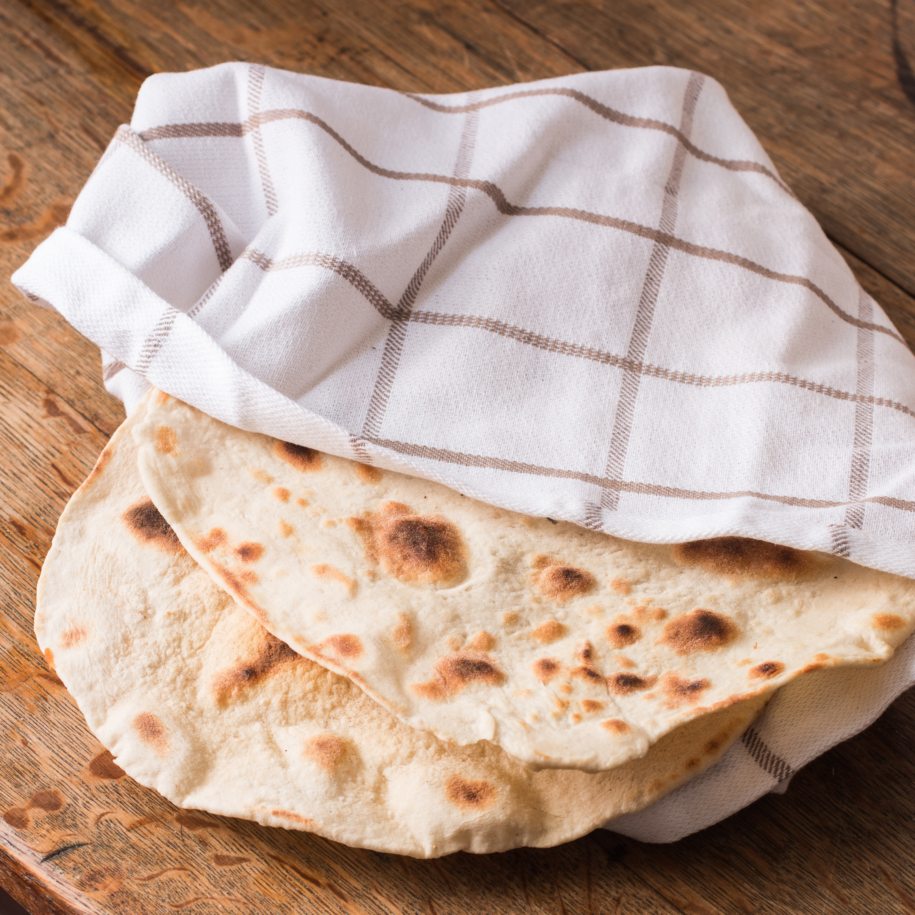 - The flatbreads don’t have to be perfect. Heat a dry skillet wide enough to fit the flatbread rounds, and cook on medium high heat, without oil. The dough should puff up and brown. Working one at a time, brown the flatbreads on each side, then transfer to a towel to rest.