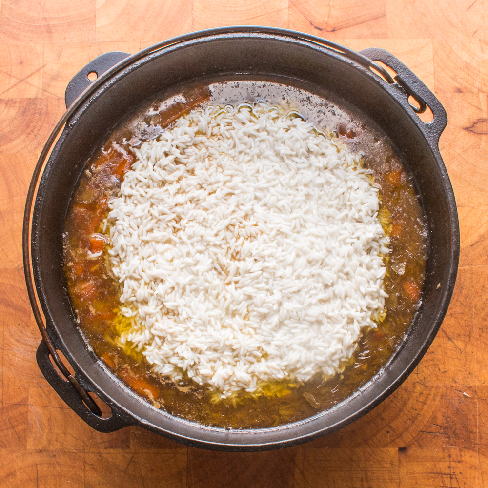 - Next, push the lamb and carrots under the liquid to give the rice somewhere to go.