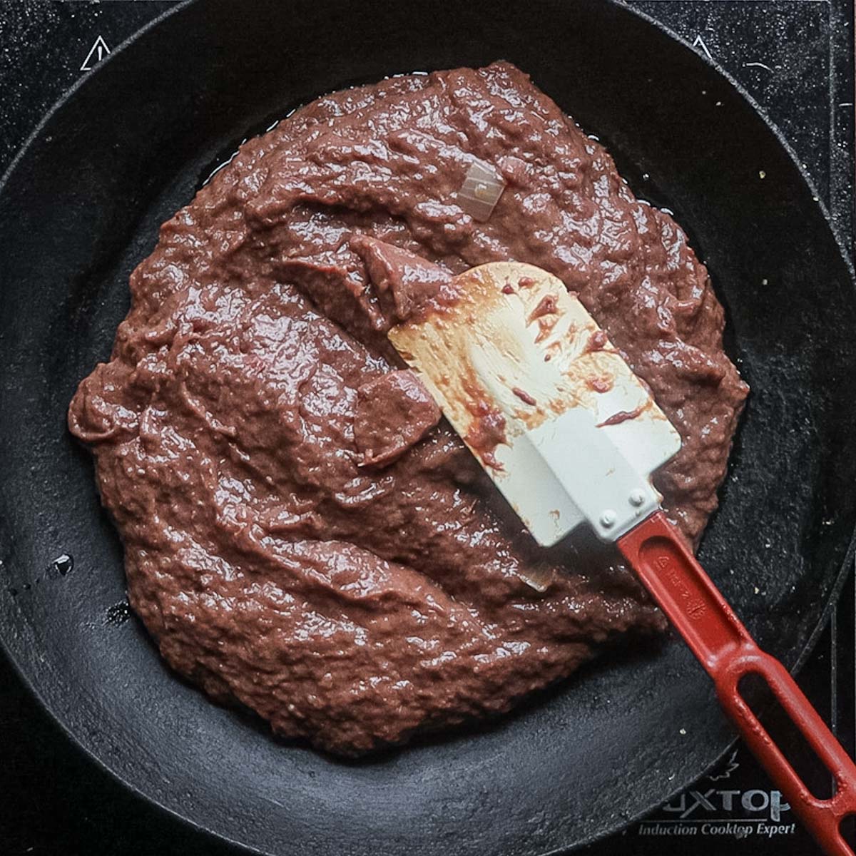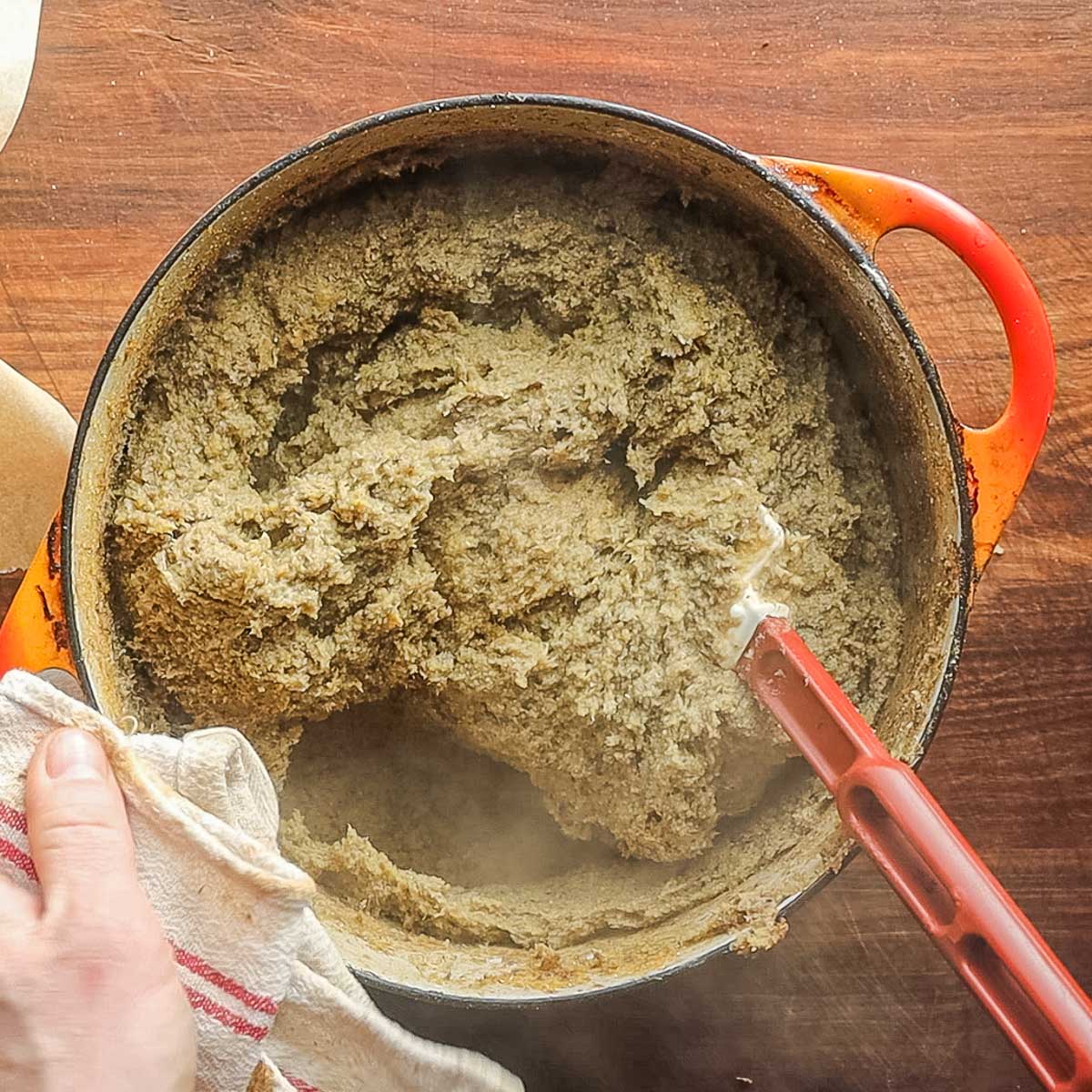 - Add the cooked meat to the cornmeal mixture, and continue cooking, stirring occasionally to prevent sticking on the bottom for another 30 minutes. You can also bake the mixture at 300 for 30 minutes, or until very thick, as long as it’s covered.