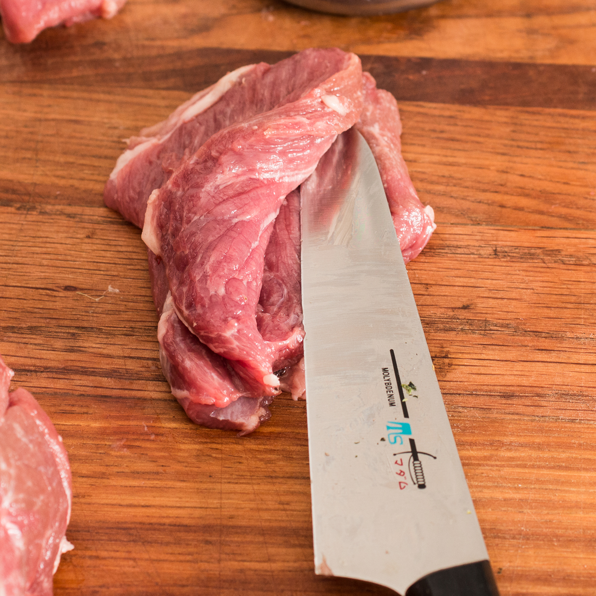 - Cut the loin into 4 equal sized pieces, then, with a sharp knife, cut them almost in half to butterfly them (see pictures). Next, pound the meat with a mallet on both sides to even it out and flatten it. Season the meat lightly with salt and pepper.