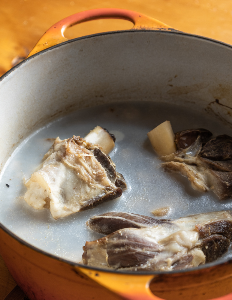 - The next day, remove the fat that congeals on top and discard. Heat the pot to melt the liquid, then remove the shanks and set aside.