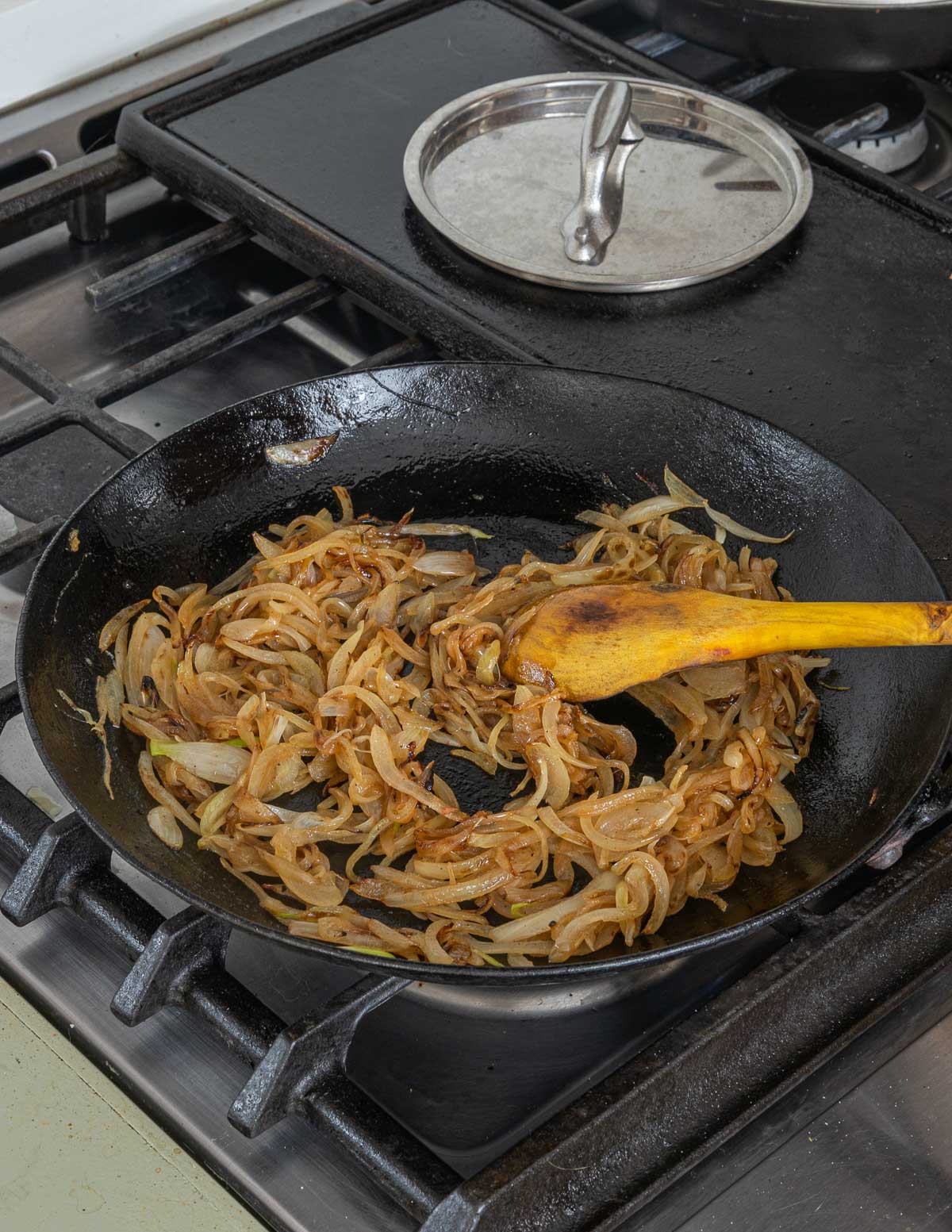 - For the fried onions, cook the onions in the ghee until golden brown, about 15 minutes on medium high heat. Remove the onions, then pulse to a coarse paste in a food processor.