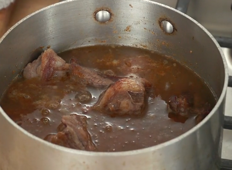 - Add the goat meat back to the pan with the stock and crumbled uziza leaves, then bring to a simmer and cook for 1.5-2 hours, or until the meat is fork tender, but not overcooked and falling apart.