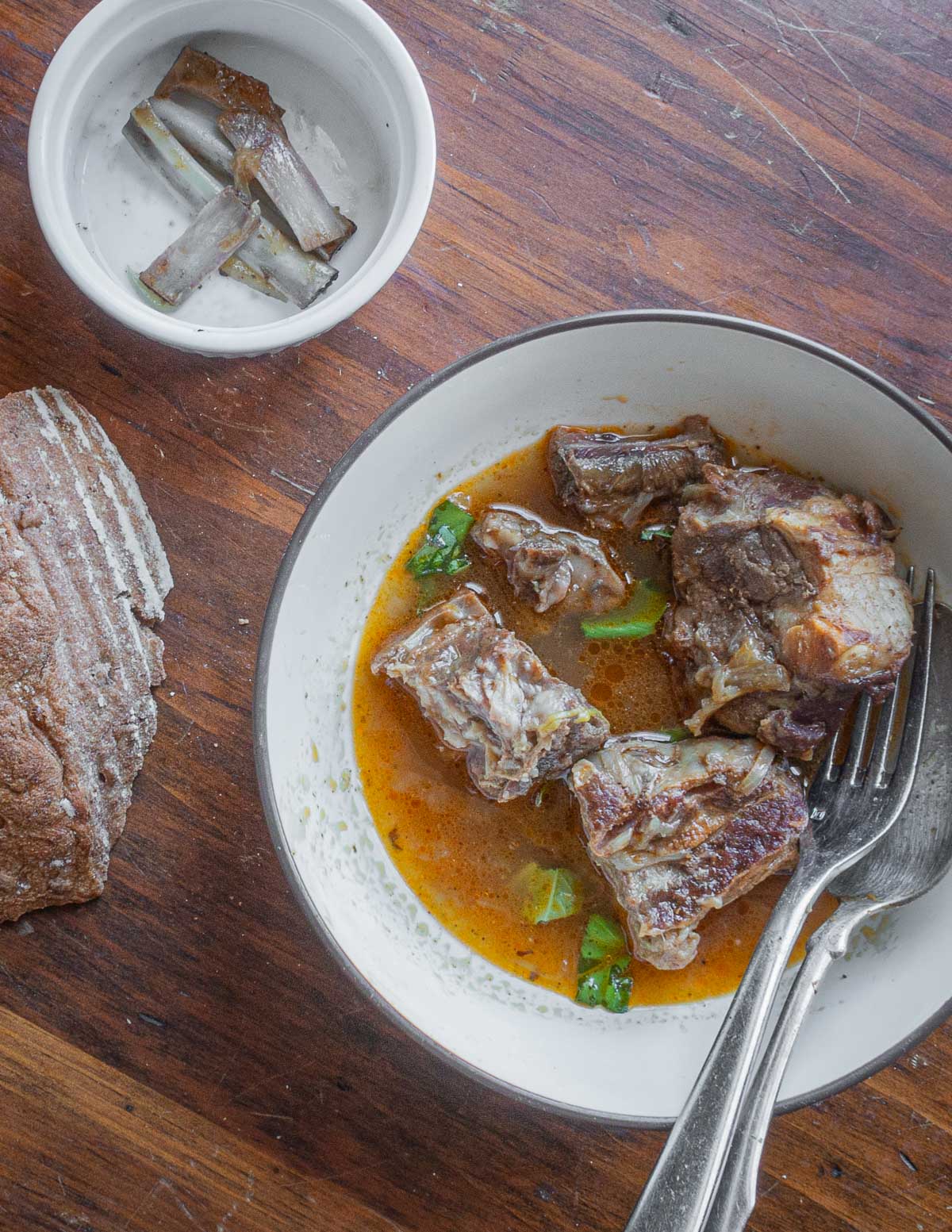 Since the bone-in goat meat pieces can be a combination of cuts from different places on the animal, there will be small pieces of bone. I like to use a spoon and fork combo to pick around the bones. Eating slowly also helps to appreciate things more.