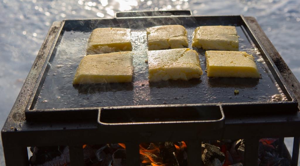 - Grease a pan with grapeseed oil and spread out polenta evenly.