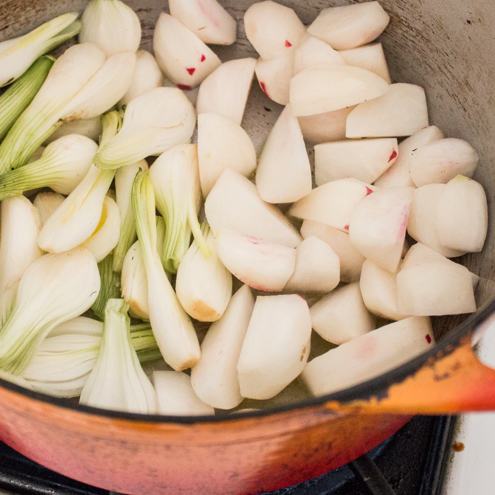 - In a large sauté or cast iron pan, heat the oil, then add the spring onions and radishes and sweat until tender. Add the remaining vegetables except for the lettuce and nettles along with the stock, and cook until the vegetables are just tender, covered, about 3-4 minutes, stirring occasionally to wilt the nettles. Season the vegetables with a good pinch of salt. Add the lamb to the pan along with the nettles and lettuce and heat through.