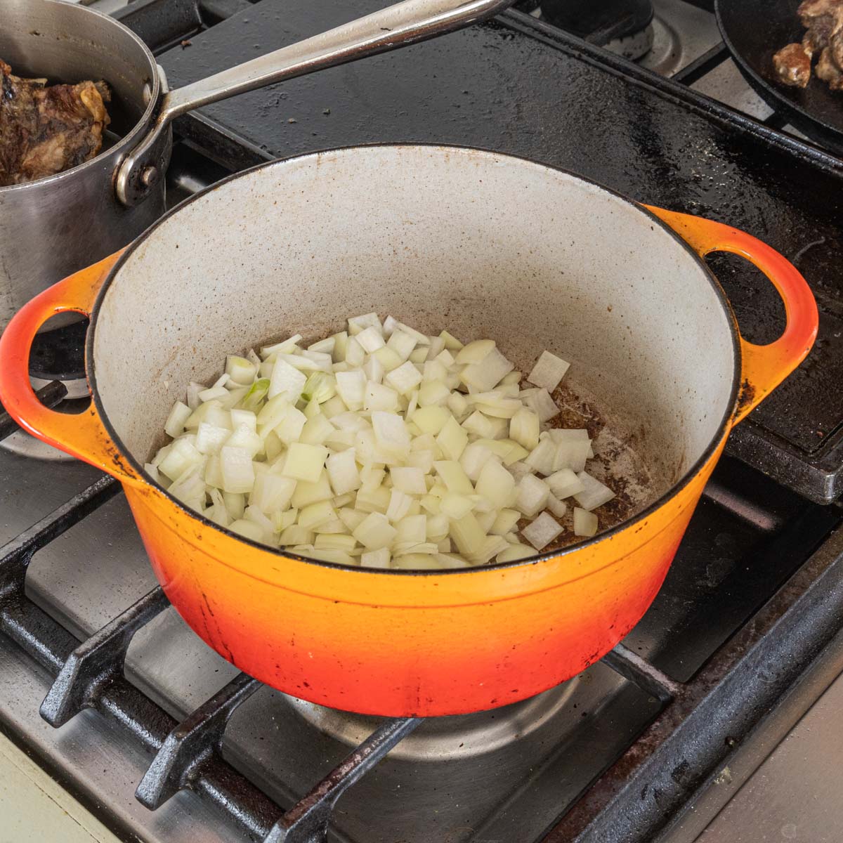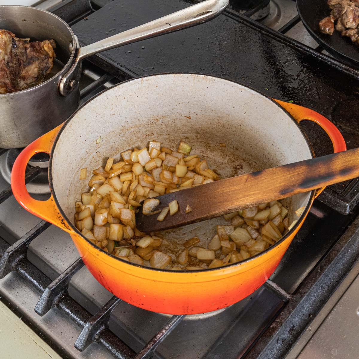 - Heat 2 teaspoons of oil a Dutch oven, brown the meat in batches, using a second pan like a cast iron skillet if you like. When one batch of meat is browned, remove it to a pan and continue.