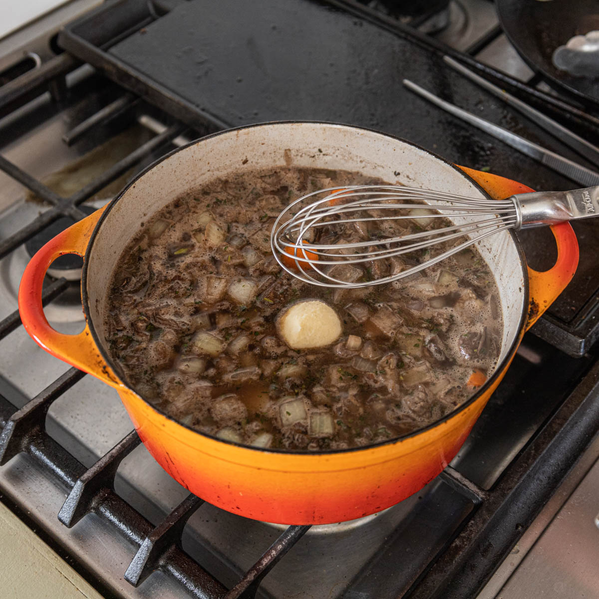 - Add the browned meat and remaining ingredients, bring to a simmer, turn the heat to a gentle simmer, cover and cook on the lowest heat for 1 hour or until the meat is tender.