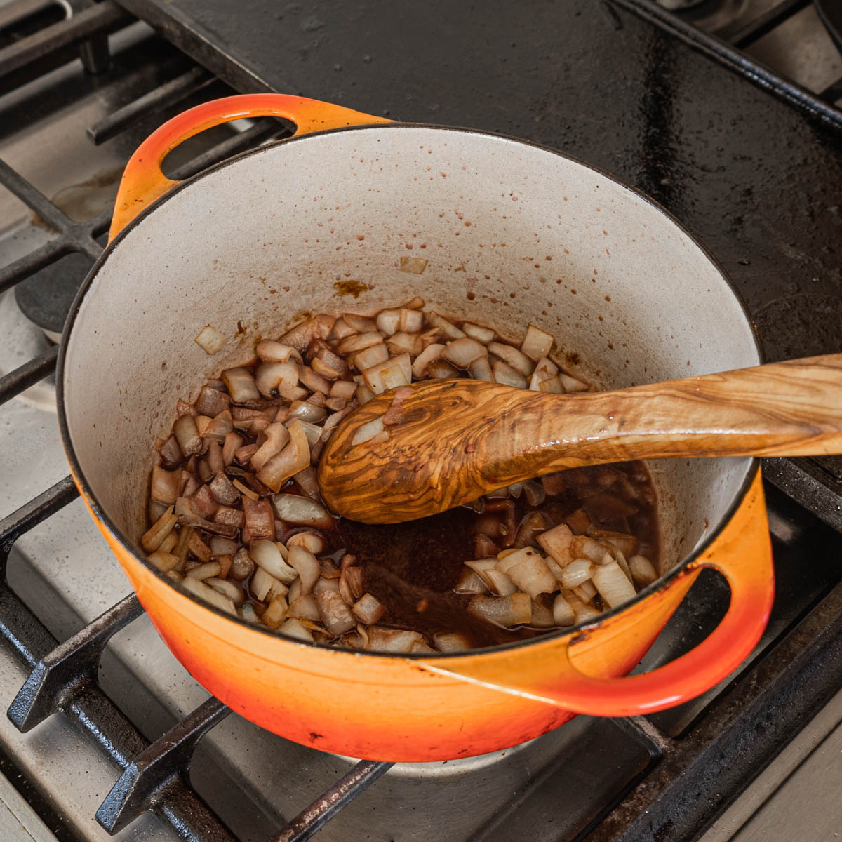 - When all the meat is browned, and before the bottom of the pan gets too dark, add the onion and another drizzle of oil, stir constantly for a minute or two to remove the browned bits, then add the red wine and reduce by half.