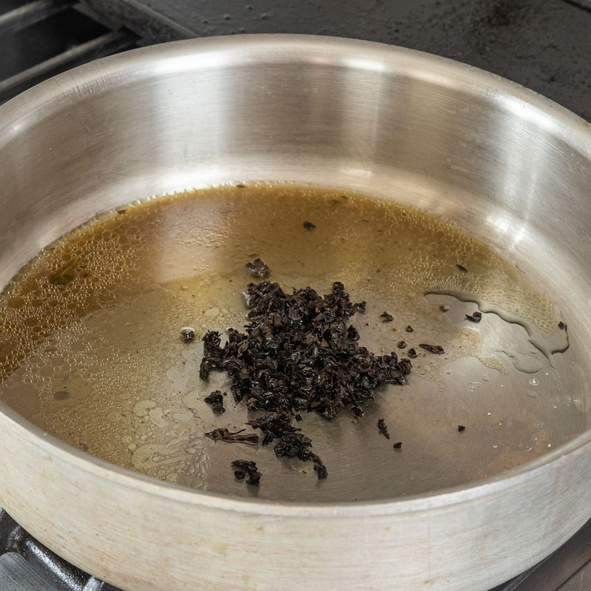 - Add the wine-stock mixture to a wide (10 inch) pan with a lid, making sure to avoid any grit left at the bottom. Finely chop the mushrooms and add to the pan.