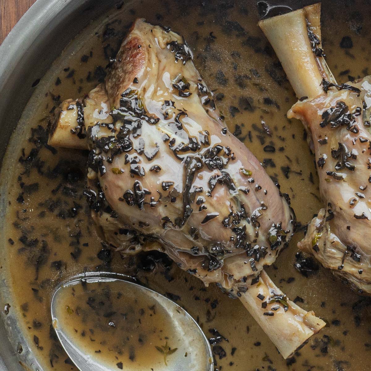 - Add the shanks and cook on medium-high heat until hot throughout, covered. Double check the seasoning of the sauce for salt and pepper, remove the lid and reduce the sauce until it looks and tastes good to you.