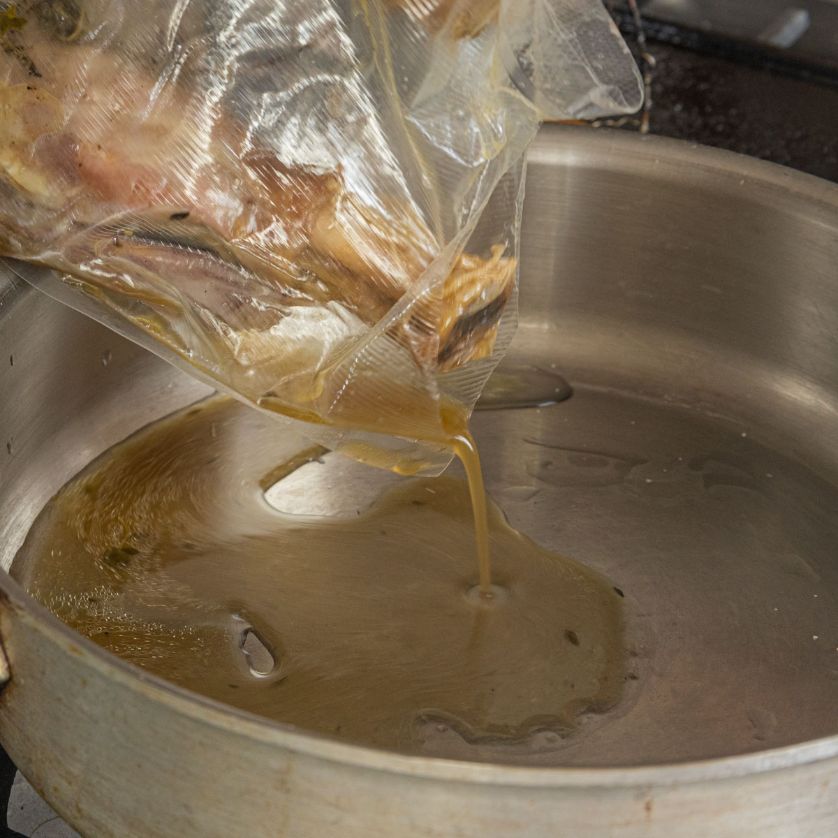 Remove the shanks from the bag and simmer them with red wine and lamb stock. Thicken the pan sauce with cornstarch and serve with mashed potatoes, rich or your favorite starch.