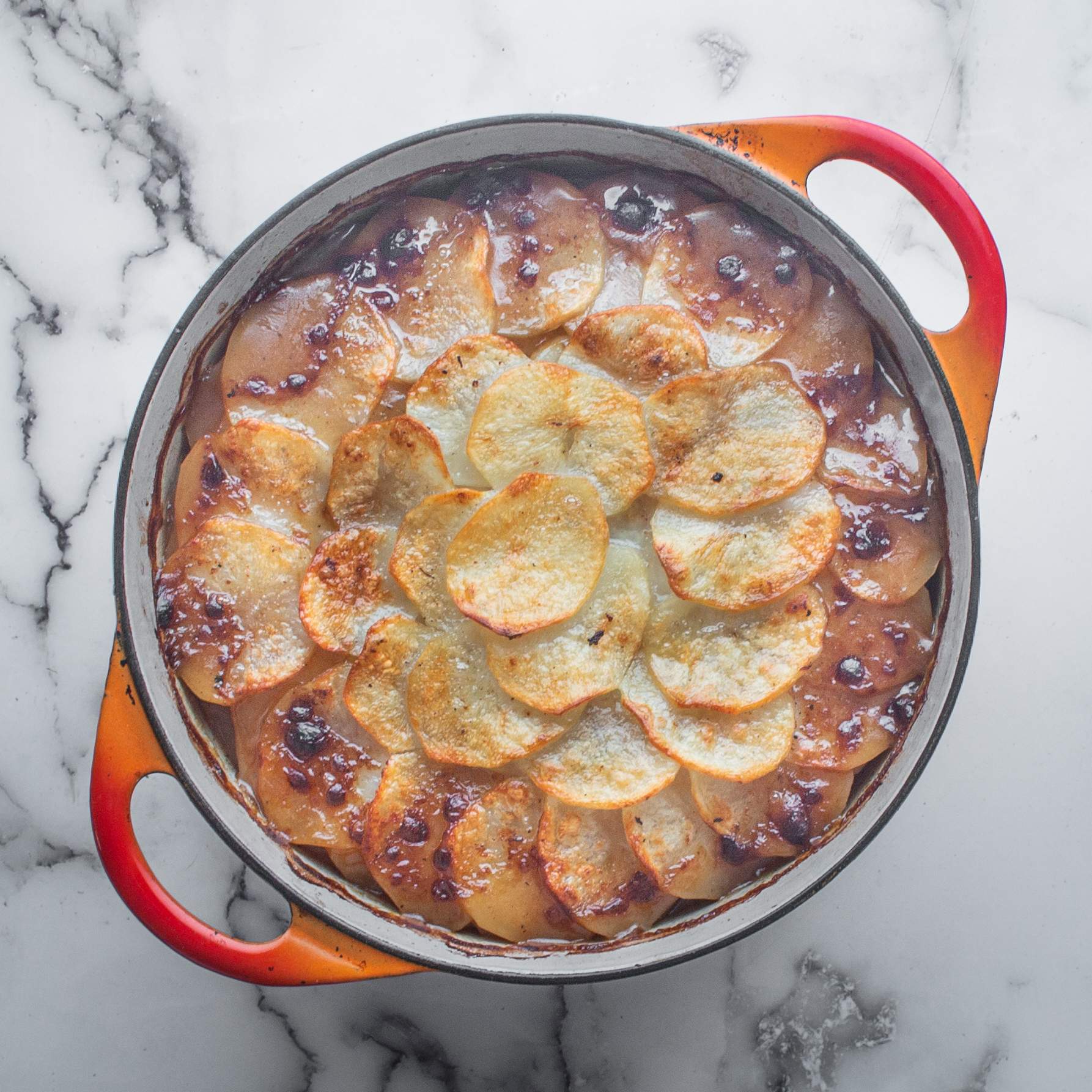 - Put the lid on the pot and bake for 45 minutes, then remove the lid, increase the heat to 475 F, baste the potatoes with lamb fat, and cook until the potatoes are browned, then serve. It will improve in flavor as it sits.