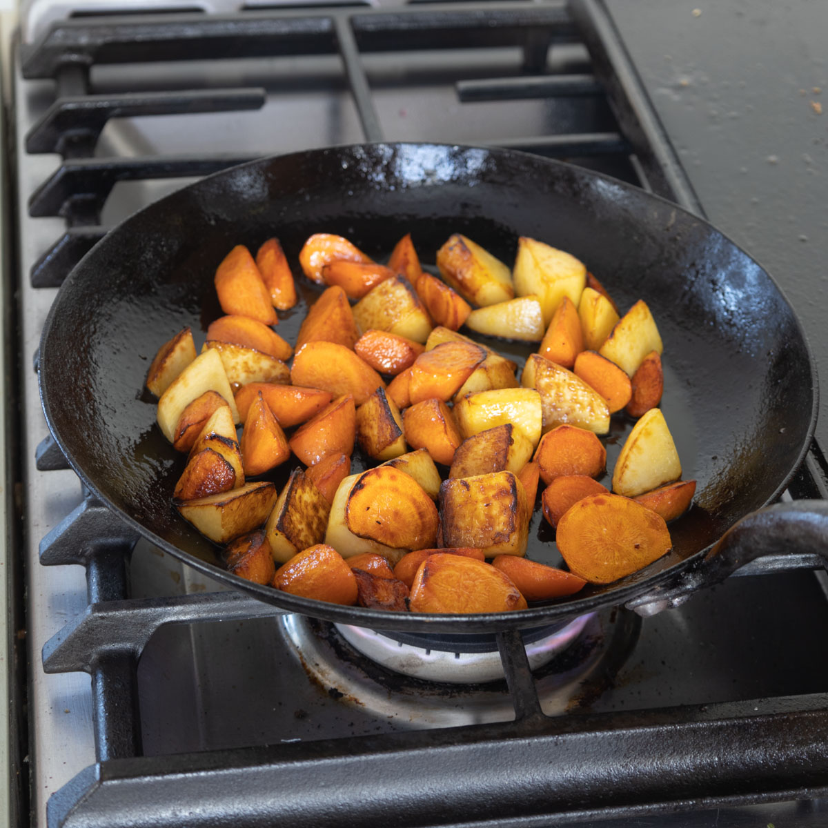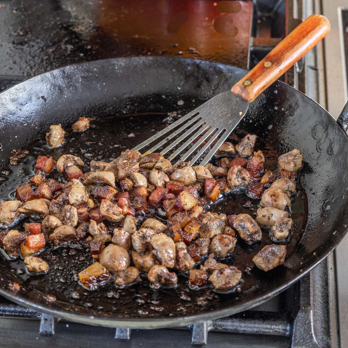 - Remove the bacon to the dish with the browned meat and pan juices then brown the kidneys in the bacon fat until golden on both sides. Add the carrot and rutabaga or turnips to the pan and cook on medium-high until browned and almost tender. Remove the kidneys from the pan to cool, then cut into ½ inch pieces.