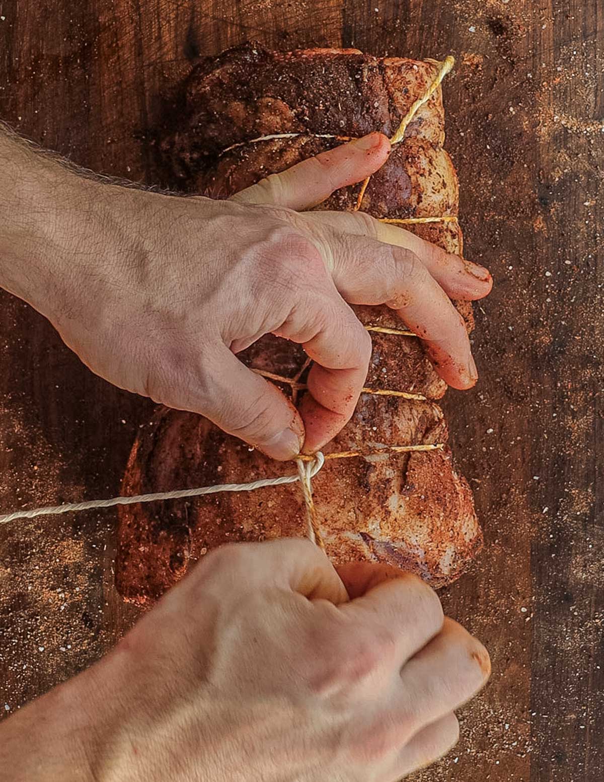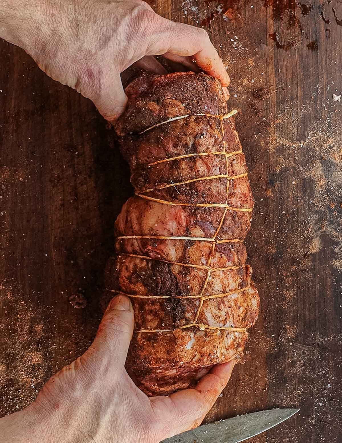 After the meat is seasoned, it’s tied with butchers twine. Large legs can be unevenly-sized after removing the bone, so you may find it helpful to cut the leg into two evenly-sized roasts. Tying the leg helps it cook evenly, but the knots don’t have to be perfect. All you need is for the leg to hold its shape.