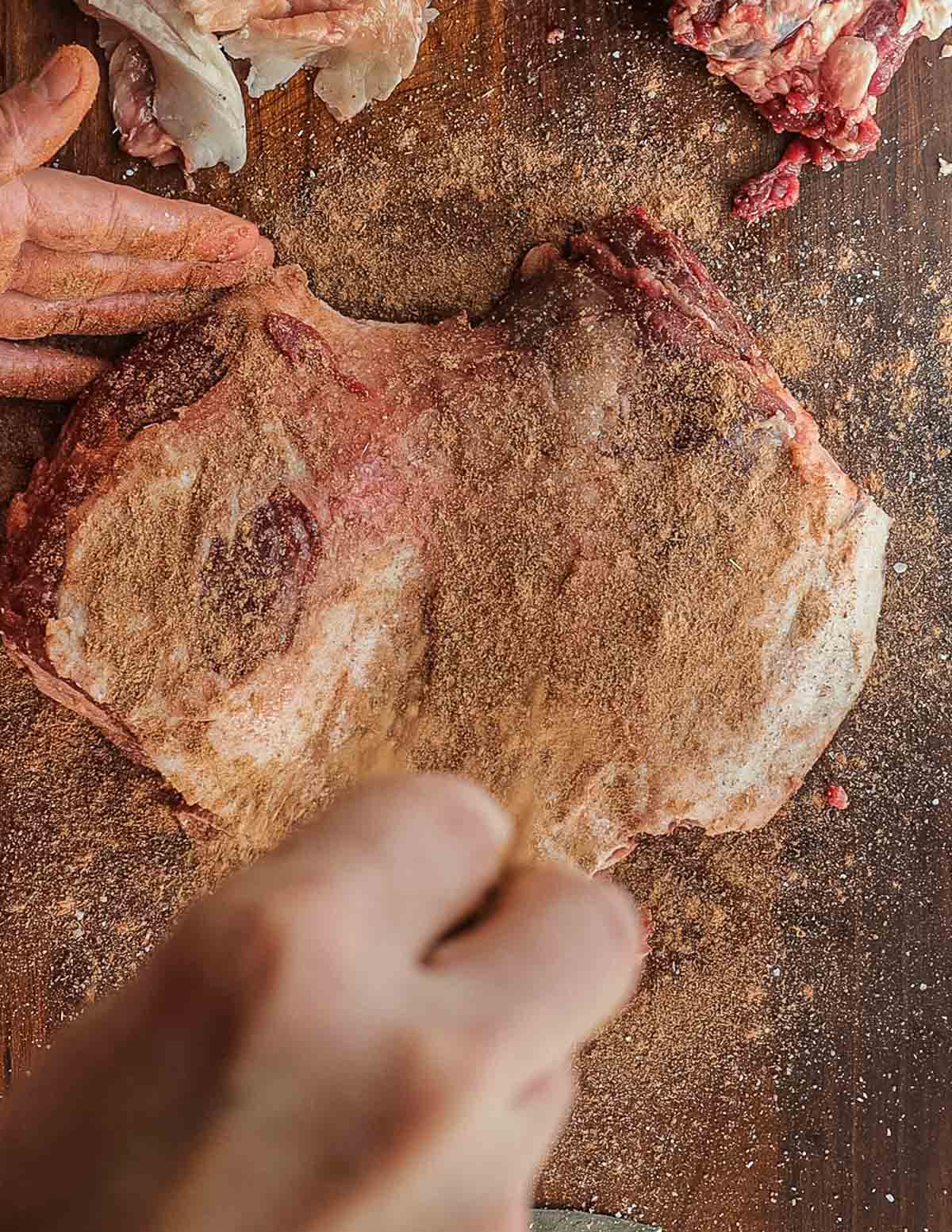 After the bones are removed, depending on your lamb and where it came from, you may want to remove some of the fat. After the fat has been trimmed, one of the most important things is seasoning the meat with a dry-brine and allowing it to rest overnight wrapped in cling film. This allows the outside of the meat to dry out and absorb the smoke as it cooks, making the delicious, smoky bark everyone loves. I use the process here with a boneless leg, but it will also work with a bone in leg of lamb.