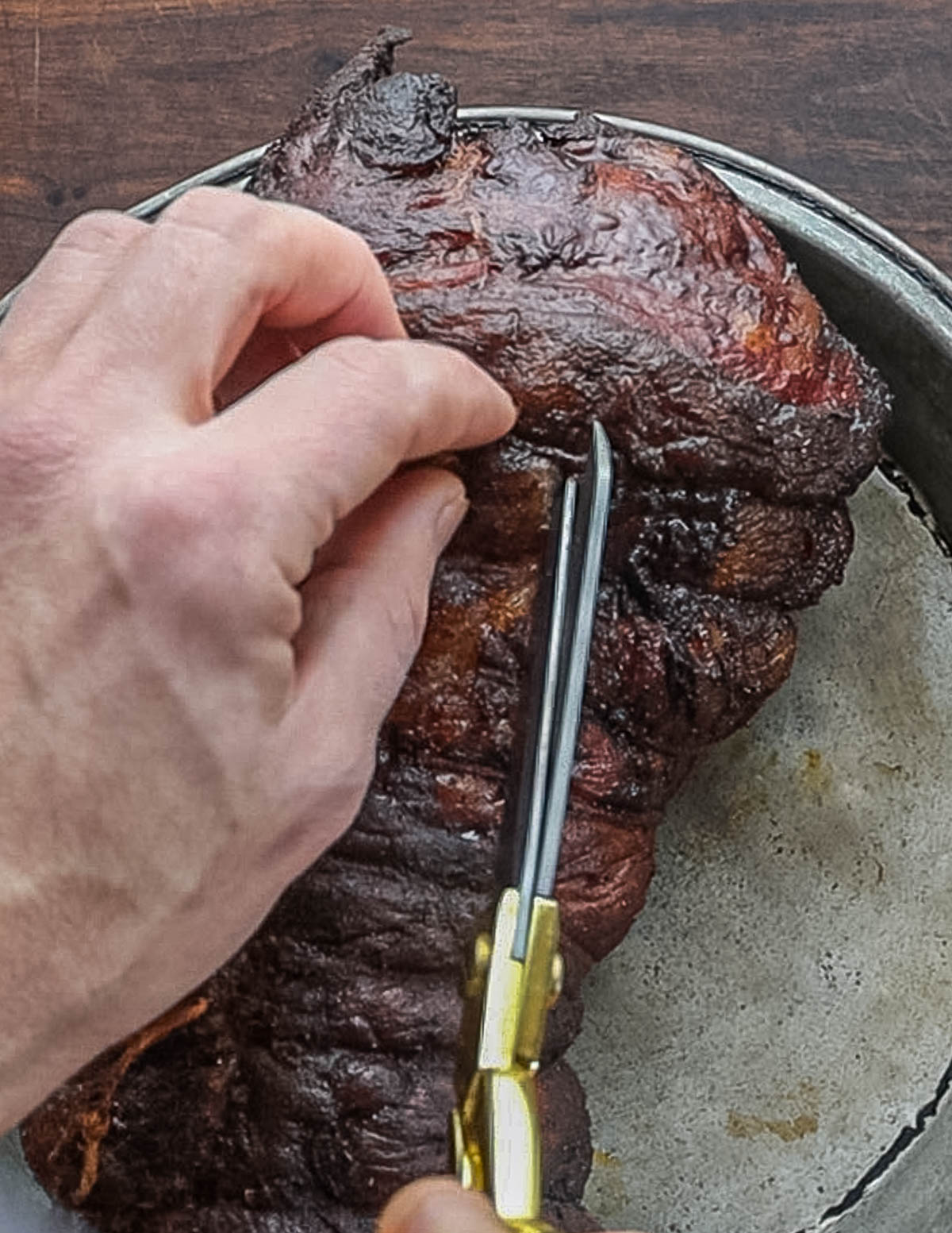 - Remove the twine with a scissors. Cut the meat into thin slices against the grain with a long sharp carving knife. Serve with some crunchy salt like Maldon at the table.