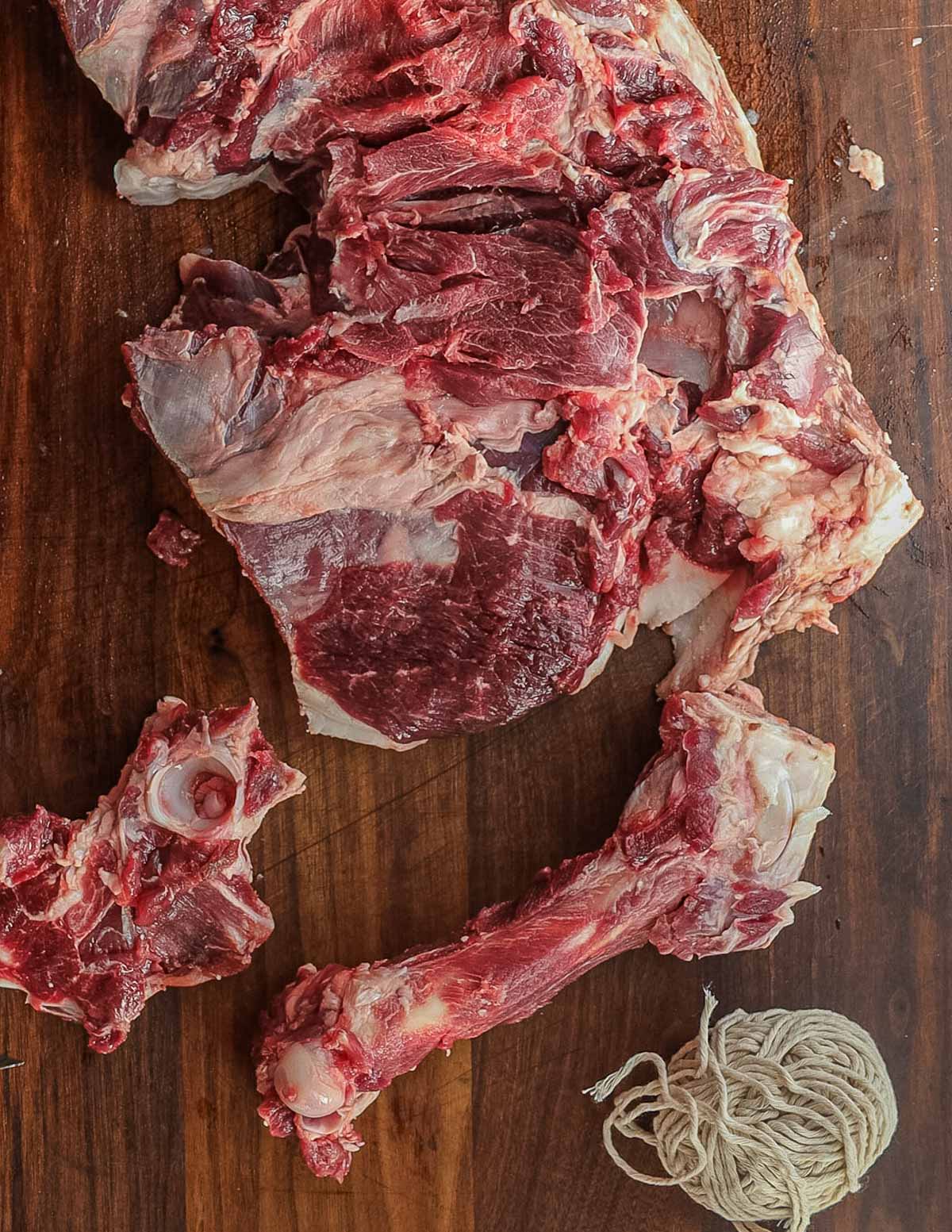 Your lamb might have come already boneless, if it did, it’s probably wrapped in butchers twine or netting too. If if is, feel free to skip down to how to smoke a leg of lamb.