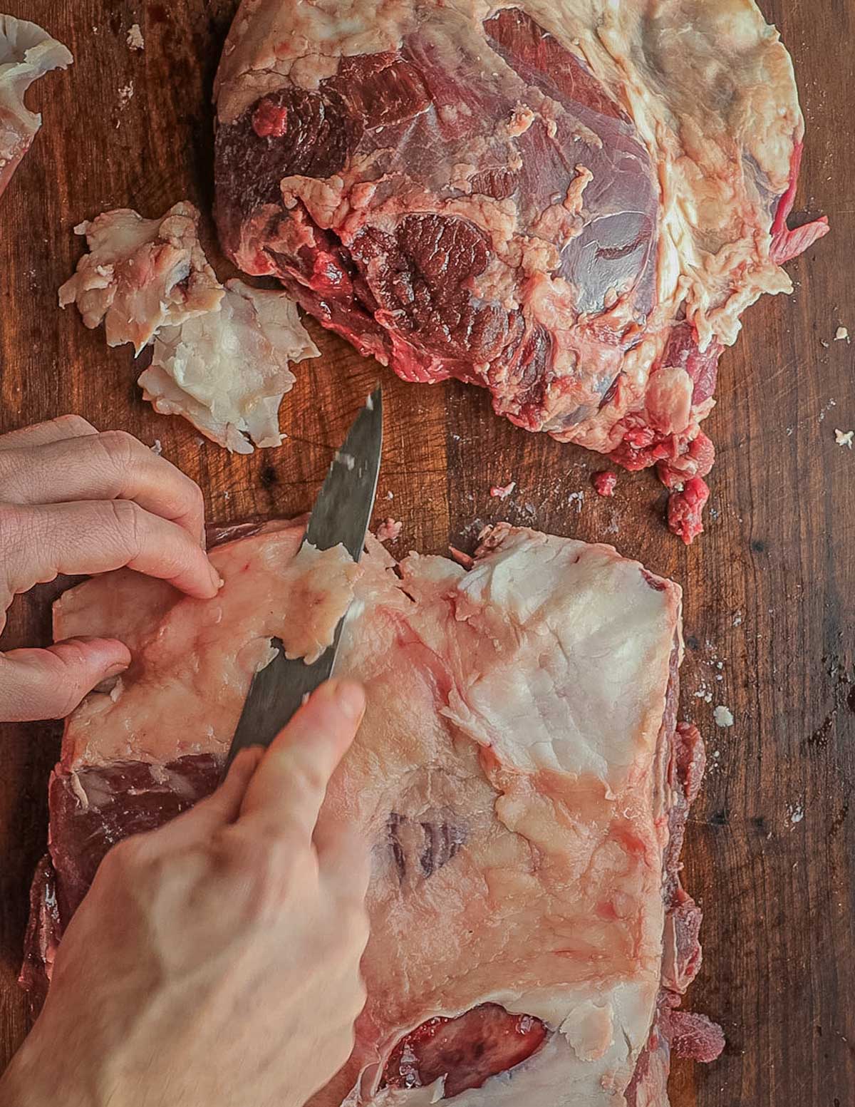 If your lamb leg still has bones in it you can remove them for easy slicing, or the leg can be cooked whole, bone-in. After the bones are removed I also like to remove as much fat as possible from the leg, which can vary depending on the age of your animal. Pictured is a larger lamb leg, around 1 year old, known as hogget. The images below illustrate the process, and I also go over it in the video.