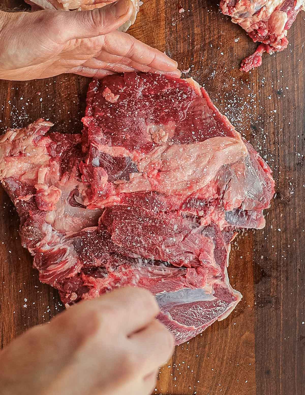 • If you haven't done this before, the video will illustrate everything for you. If your lamb leg came already de-boned, you can skip to dry-brining the lamb.