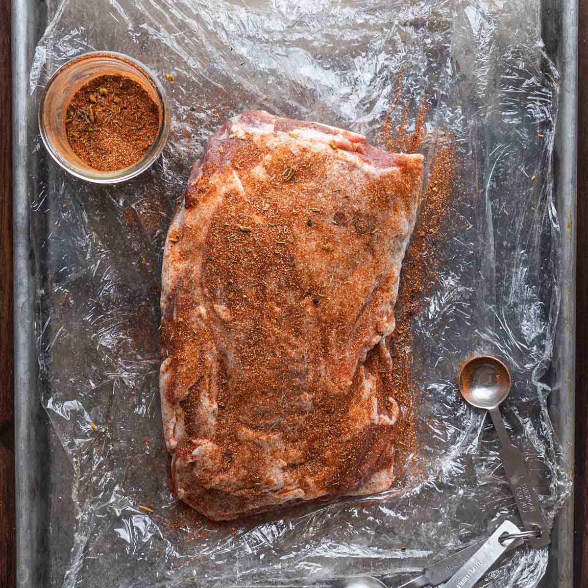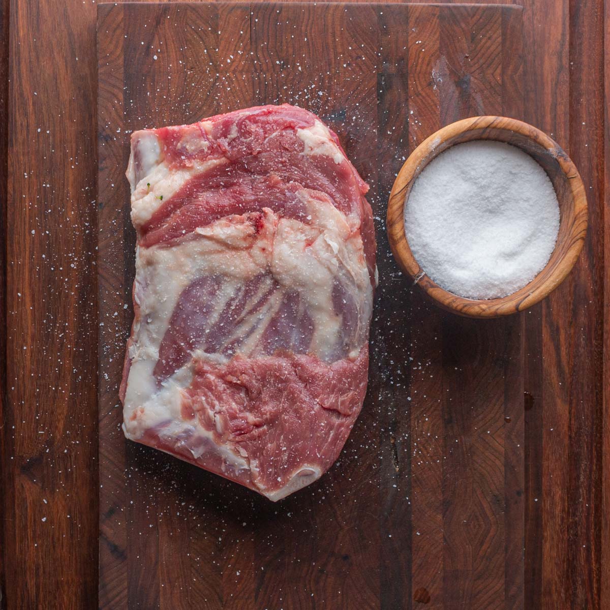 - Season the lamb shoulder with the salt all over on each side-this will take about 1.5-2 Tablespoons of cure. Wrap the shoulder in cling film and allow to rest in the fridge overnight.