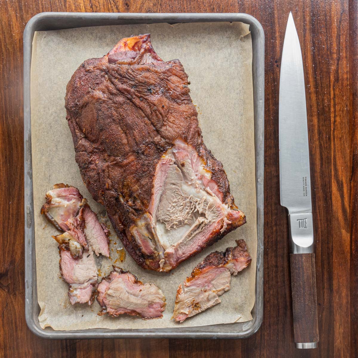 - Remove the shoulder from the oven and allow to rest for 10 minutes, then slice with a knife, or pull the meat from the shoulder blade and shred with two forks.