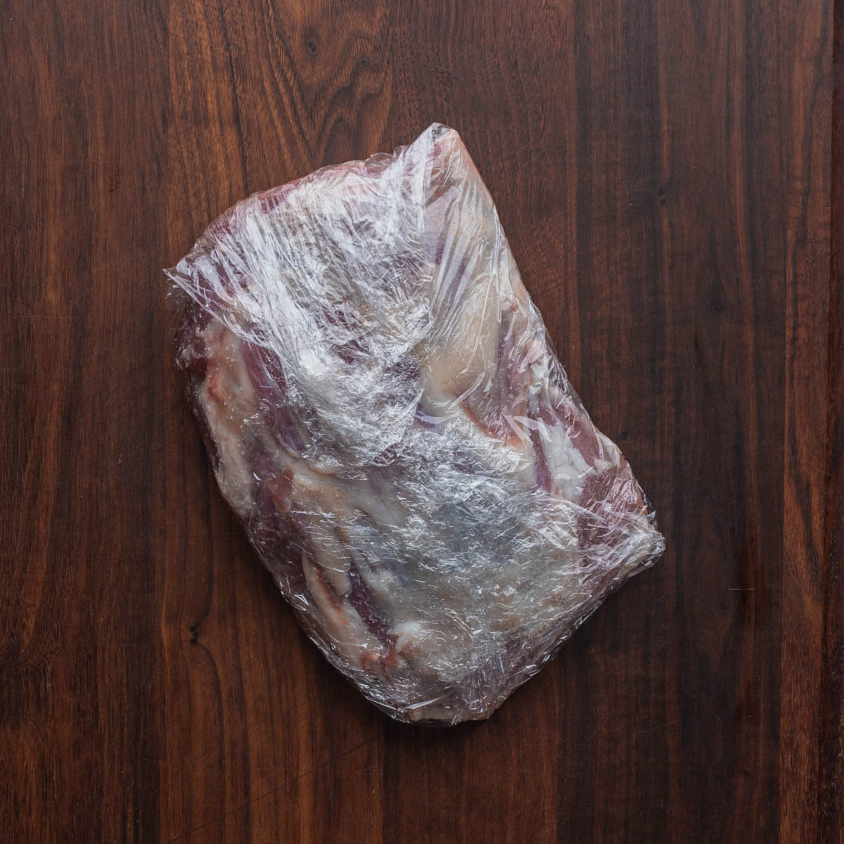 - Season the lamb shoulder with the salt all over on each side-this will take about 1.5-2 Tablespoons of cure. Wrap the shoulder in cling film and allow to rest in the fridge overnight.