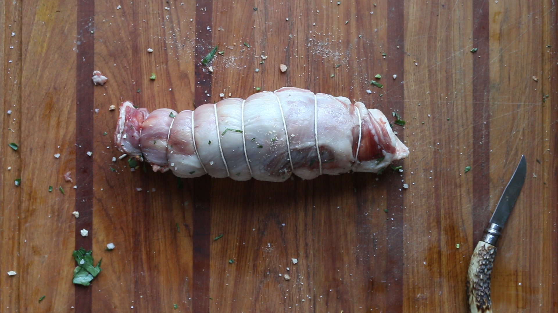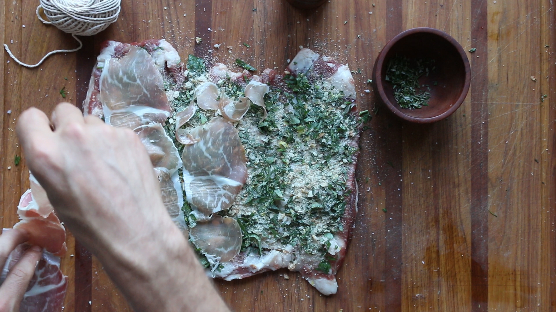 - Season the breast on one side with salt and pepper, then sprinkle on the rosemary, parsley and zest, breadcrumbs, and finally lay down a few slices of prosciutto.