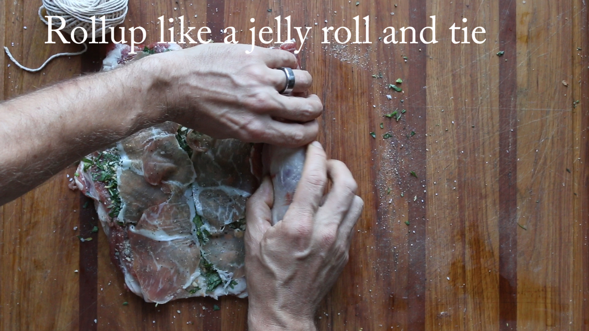 - Season the breast on one side with salt and pepper, then sprinkle on the rosemary, parsley and zest, breadcrumbs, and finally lay down a few slices of prosciutto.