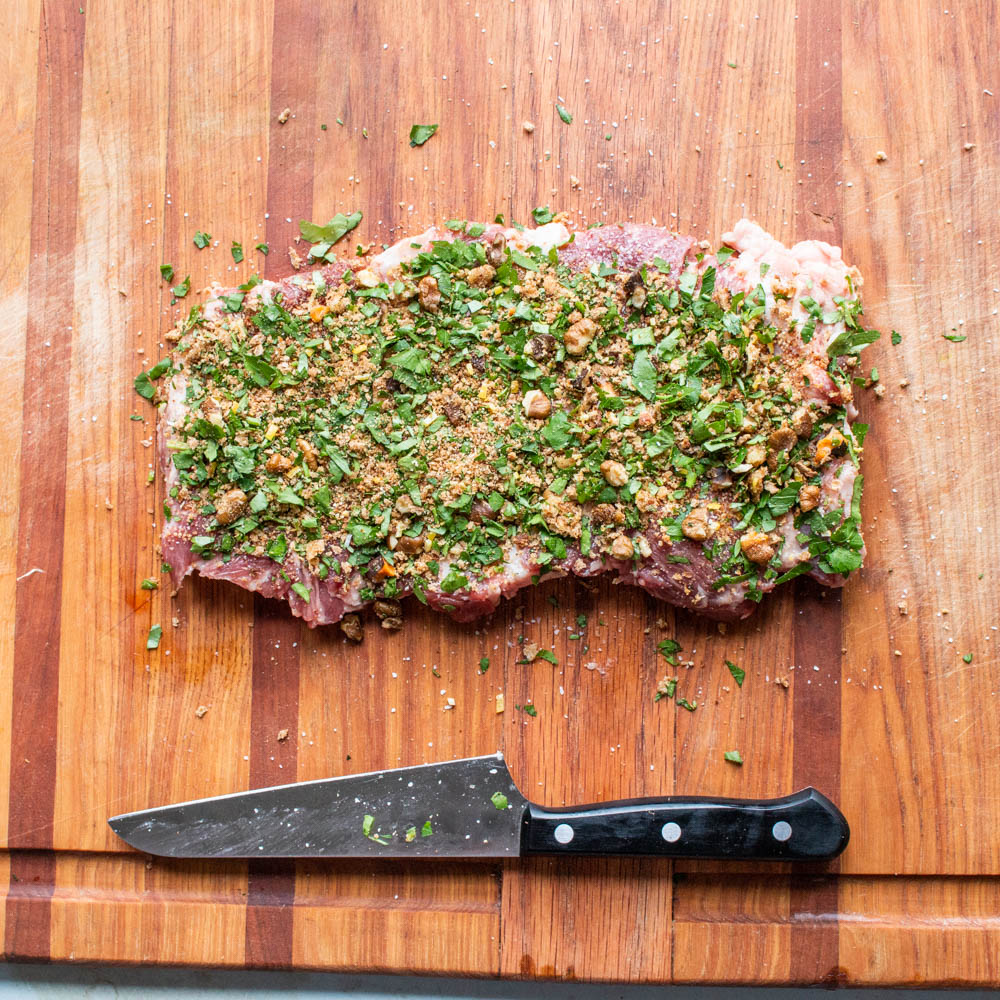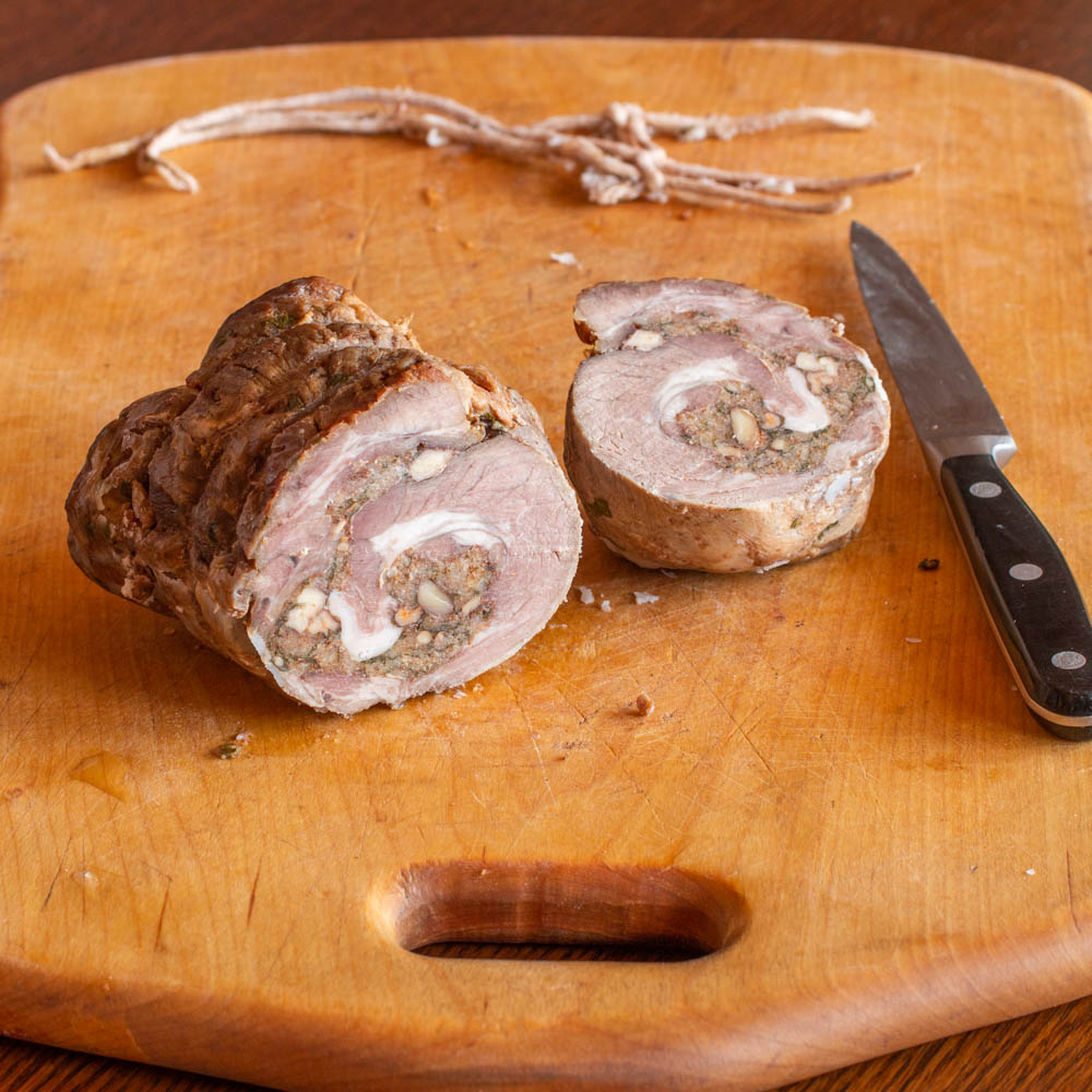 With the stuffing, less is more. A sprinkle of breadcrumbs, a scattering of toasted nuts and a small handful of chopped parsley is all you need, too many ingredients can make it difficult to make the rolls and get clean, attractive slices as pictured. Chef stuffed the roast pictured with black walnuts—a special treat, but any nut, or no nuts, are fine.