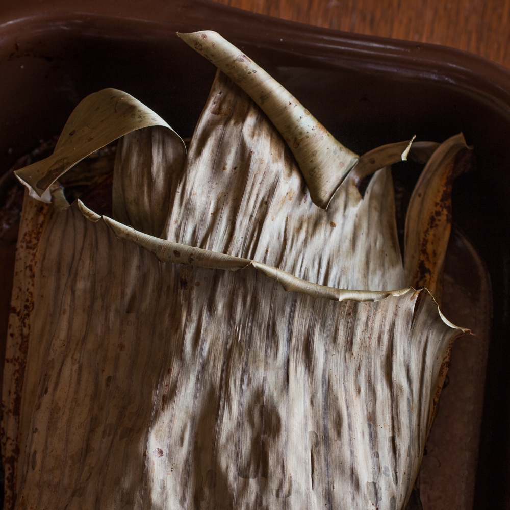 Pour any excess marinade over the leg, then wrap tightly in the rest of the banana leaves, pour 2 cups of water into the dish, and bake for 3-4 hours or until fork tender.
