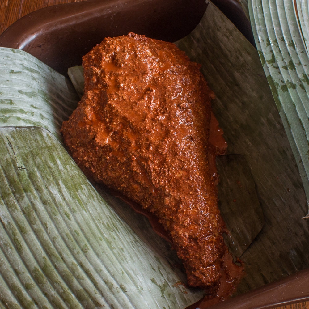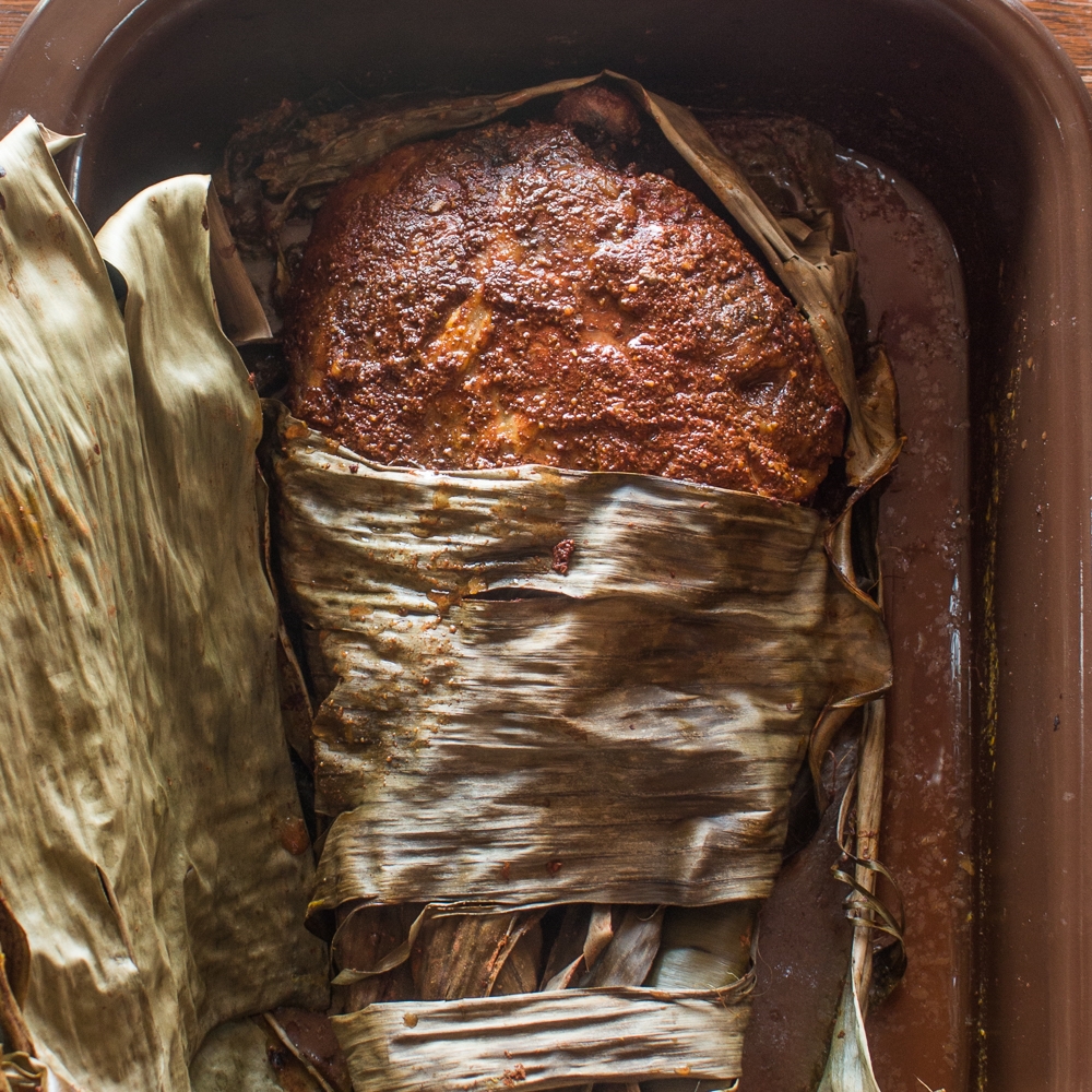 A goat leg rubbed with achiote marinade and baked slowly until tender in banana leaves.Chef Alan Bergo