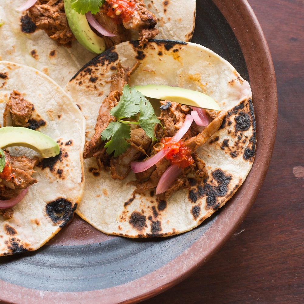 Finshied cochinita tacos use corn tortillas, habanero salsa, and marinated onions